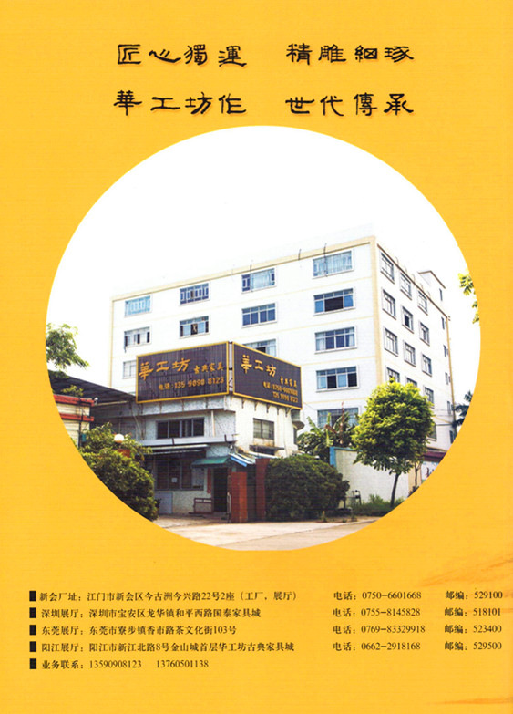 华工坊古典家具位于中国古典家具之都广东省江门·新会,是一家集产品研发、设计生产、销售、服务于一体的专业高档红木古典家具制造企业。
